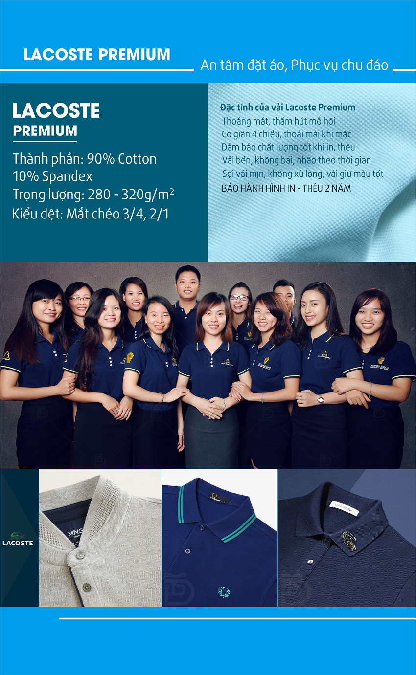 Đồng phục ADP xin giới thiệu tới mọi người chi tiết Bảng màu vải Lacoste Premium. Đây là mẫu vải được nhiều công ty lựa chọn để may đồng phục. Cùng với những ưu điểm trong độ thoáng, mát của chất vải – Lacoste Premium là sự lựa chọn tuyệt vời cho những mẫu đồng phục chất lượng nhất.