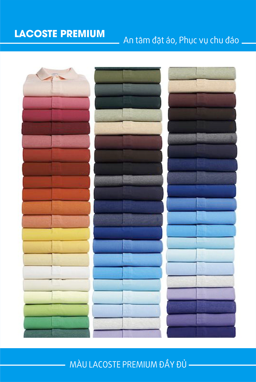 Mặc dù bảng màu vải Lacoste Premium rất đa dạng nhưng Đồng phục ADP đã chọn lọc những màu áo đồng phục mà khách hàng thường may in. Đây cũng chính là những màu vải thường được ADP đặt hàng và có sẵn trong kho. Nếu mọi người lựa chọn một trong số những màu trong bảng màu vải đầy đủ. Xin mọi người có thể liên hệ trực tiếp tới Đồng phục ADP để kiểm tra chi tiết màu vải mọi người đang lựa chọn hiện có đáp ứng được yêu cầu của mọi người hay không.