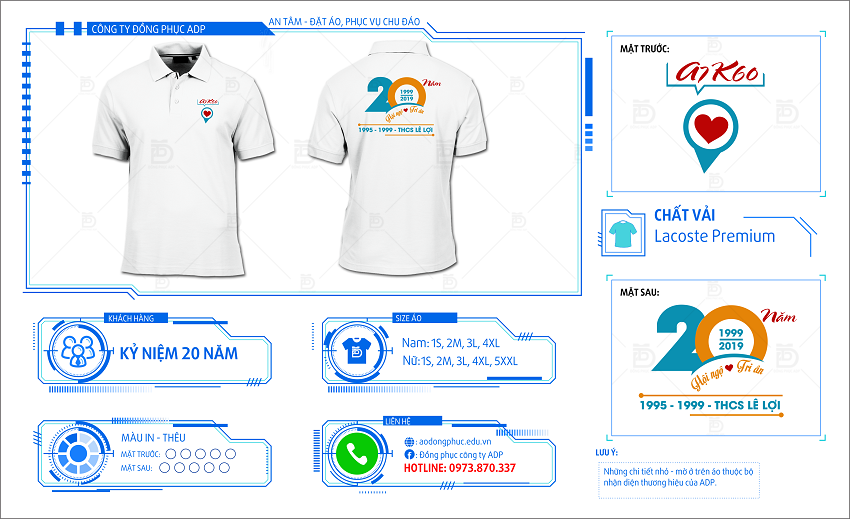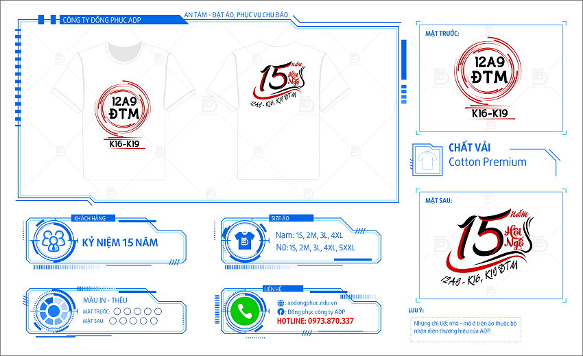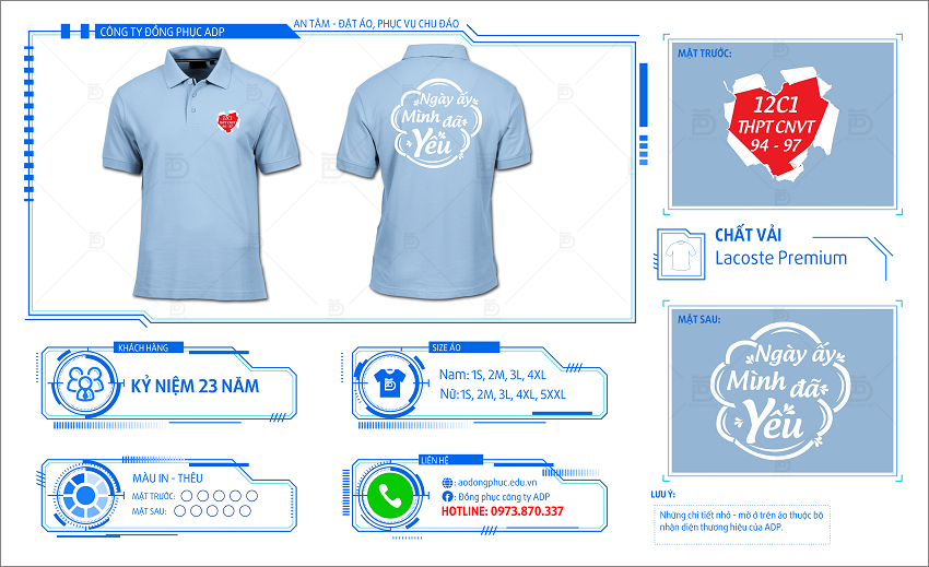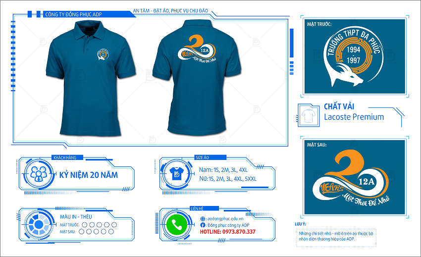 Đồng phục ADP giới thiệu với mọi người mẫu áo đồng phục họp lớp 20 năm mang mã số HL16. Đây là mẫu áo được thiết kế trên tông màu xanh cực ngầu. Mẫu áo đồng phục họp lớp HL16 được thiết kế nhấn vào năm 1979 – tuổi Kỷ Mùi cũng là năm sinh