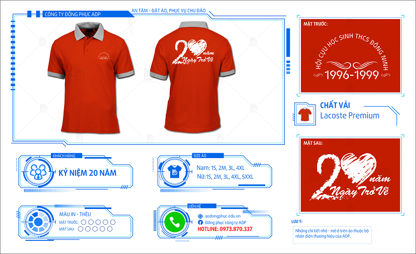 Đây là mẫu áo đồng phục họp lớp màu đỏ thiết kế cho dịp họp lớp 20 năm của các anh chị cựu học sinh trường THCS Đông Ninh. Đồng phục ADP giới thiệu tới tất cả các anh chị để các anh chị cùng tham khảo và lựa chọn một mẫu đồng phục cho nhân dịp tụ họp của mình.